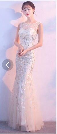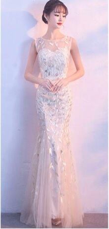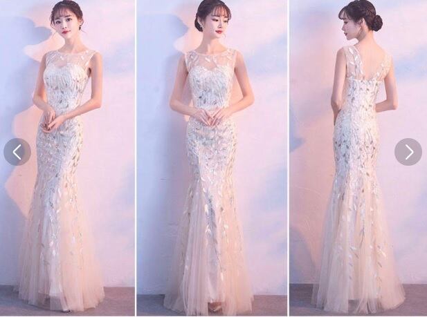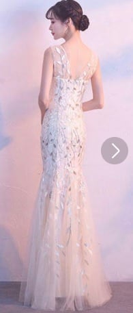 チュールのマーメイドドレス。サテン地に鮮やかな金の小さなスパンコールをつなげた刺繍が施されたチュ-ルを重ねた豪華なデザイン。くびれたウエストがセクシーさを醸し出しています。パーティやライブ、イベントなど華やかなシーンに。デザイン上伸縮性はそれほどなく体のラインにフィットしたシルエットです。背中ファスナー有。裏地なし。胸パット有。