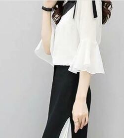 ブラウスとワイドパンツのセットアップ。やわらかな白と黒の生地を使用。上は幅広の黒のバイパスをとった襟ぐりと袖先が広がった七分袖がやさしい雰囲気を醸し出しています。ボトムはサイドに白のプリーツをあしらったワイドパンツ。全体的に優しくフェミニンな印象です。ちょっとおしゃれな普段着としても、またフォーマルなシーンにも活躍してくれる一着です。裏地なし。ブラウスはファスナーなしのかぶるタイプ。パンツはウエストがゴム仕様になっています。