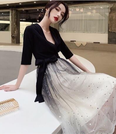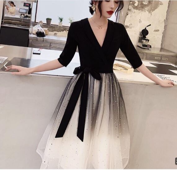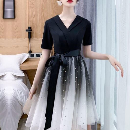 シフォンのミディアムドレスです。上半身は黒のポリエステル生地を使用し、ウエストから裾にかけては白のサテン地の上に白と黒のチュールを2枚重ねボリュームを出しています。またチュ-ルには全体的に星のビジュ-飾りが施されています。パーティやイベント、結婚式など、様々なシーンで、気品のある印象を与えてくれる一枚です。背中ファスナ-有。胸パッド付。ウエスト布ベルト付き(取り外し可能)。