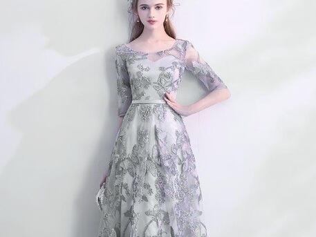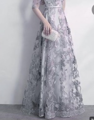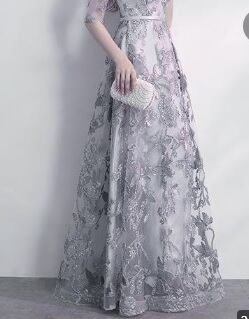 リボン刺繍のパーティ-ロングドレス。袖やデコルテの透け感がとても美しく大人の女性を醸し出してくれるエレガントなデザイン。全体にシルバ-系の立体刺繍が施されデザイン性のあるスタイルがとても魅力的な一着です。全体的に優しい感じに仕上げられています。背中ファスナ-有。胸パット付き。裏地有。