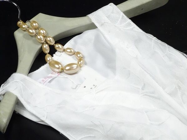 花模様のレース仕立てマキシ丈のワンピース。白の下地の上に、大きな花と葉を白糸で刺繍したレースをかぶせていて、薄い透け感がやわらかな印象を与えてくれています。大きなラウンドネックにノースリーブも全体の中でバランスが良く、ピュアでフェアリーなデザインになっています。煌めく太陽の光の中でも、また新緑の爽やかな風の中でも、着る人を美しく魅せてくれる一着です。透け感があるのでインナー着用をお勧めします。背中ファスナー。