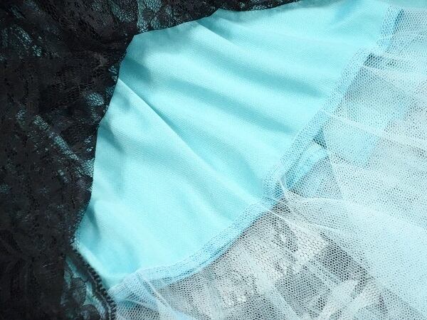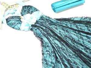 ウエストリボンモチーフチュール仕立てのドレスワンピースです。水色の生地の上に黒のレース生地が被さり、レースにあしらわれた花模様が美しく浮かび上がっています。裾はたっぷりとしたチュール仕立てになっていて、ウエストのリボンがインパクトのある印象を与えています。裏地付。ファスナ-なし(かぶるタイプ)。