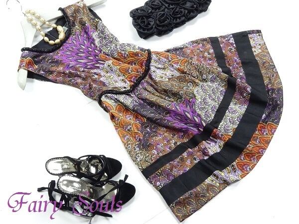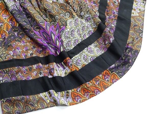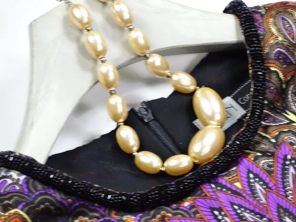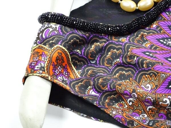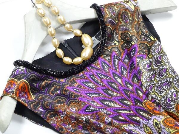 オリエンタル柄襟元飾りのワンピース。やわらかなシルク混の生地にオリエンタルな柄がプリントされ、襟元とウエストには黒のビーズを立体的にあしらい豪華な印象に。裾の黒のラインが全体をきゅっと引き締めています。S表示ですがゆったりしています。背中ファスナー。裏地付。