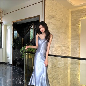 とろみ光沢のあるキャミワンピース。光沢のあるシックなシルバーグレーのサテン地を使用。軽く、体にフィットしたスリムな大人の女性を醸し出してくれる一着です。裏地なし。ファスナ-なしのかぶるタイプ。肩紐は長さ調整不可。