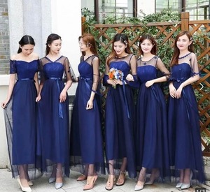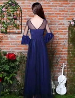 チュールロング丈のパーティードレス。ネイビーのサテン地の上に深いネイビーのチュールをかぶせています。胸元のデコルテラインと、袖は肘までがチュールのみで透け感があり、肌を美しく見せてくれています。肘から先、袖先までは同色のレースのフリルがたっぷりと使用され、フェアリーでゴージャスな雰囲気を醸し出しています。背中は両肩先からウエスト中央まで大胆に開いており、フロント側から見た印象とバック側から見た印象に良いギャップを生み出しています。パーティやイベント、結婚式など、様々なシーンで、気品のある印象を与えてくれる一枚です。裏地有。背中ファスナ-有。胸パット付。