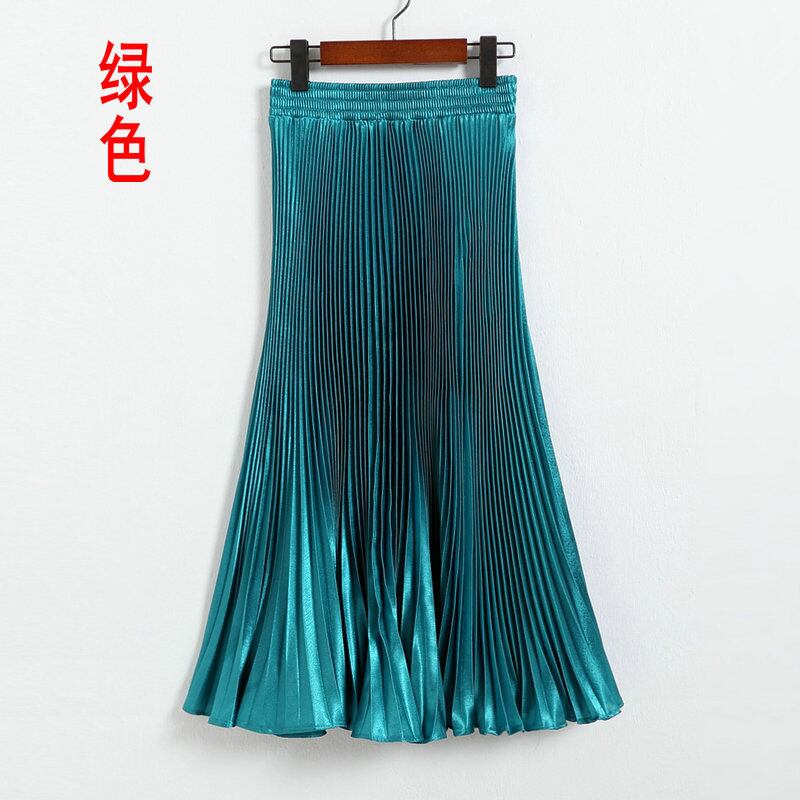 光沢メタリックグリ-ンロングプリ-ツスカ-トです。しわになりにくく動くたびに揺れるエレガントなプリ-ツスカ-トです。ファスナ-なし(ウエストゴム仕様)。裏地なし。