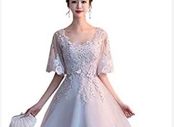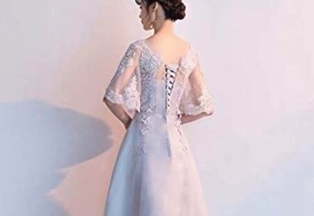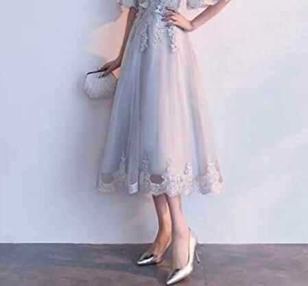 レースとチュールミディアム丈のドレス。淡いグレ-のサテン地の上に、立体的なグレ-の花レースとチュ-ルが重ねられた豪華でフェミニンなデザイン。袖はチュールに刺繍を施していて、チュール部分の透け感が美しく、シックで上品な女性を表現しています。パーティやイベント、コンサート、結婚式にと、さまざまシーンで活躍してくれる魅力的な一着。裏地あり。背中結び紐有り。背中腰から下ファスナー有。胸パット付。