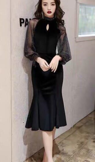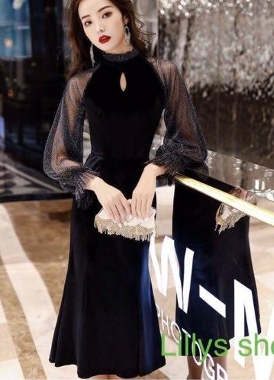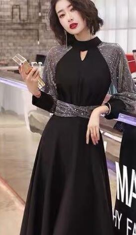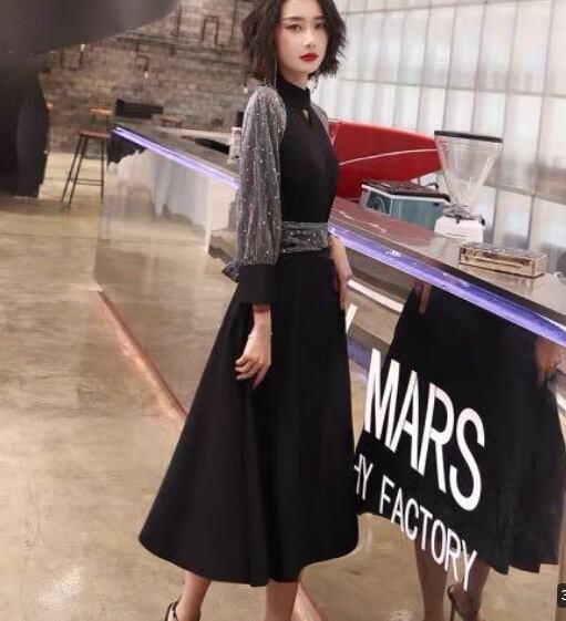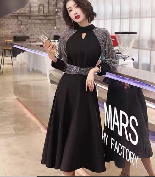異素材仕様のワンピース。ワンピース本多は伸縮性のあるジャージ素材を使用。肩からラグランスタイルの袖は、袖先にかけて黒地に銀のラインと星のスパンコールをあしらい、エレガントかつ上品な飽きのこないデザイン。同生地のウエストリボンは取り外し可能で使いまわしやすい仕様になっています。ちょっとおしゃれな普段着や、パーティ、結婚式の二次会、コンサートにと、いろいろなシーンで活躍してくれる一着です。 裏地なし。背中ファスナ-有。ウエストリボン付き。