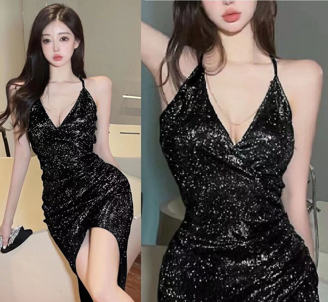 ミディアム丈キャミドレス。光の当たり具合で輝きが変わります。セクシーなデザインで、夜会など大人の雰囲気に似合う一着です。裏地なし。