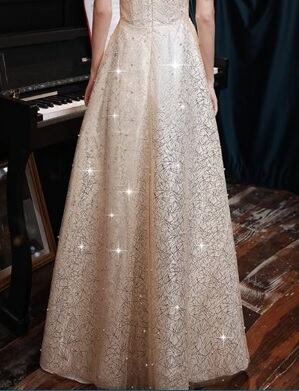 金糸刺繍とオーガンジ-のロングドレスです。ゴールドの下地に金糸が施されたゴールドのオーガンジ-を重ね全体的にフェミニンでエレガントな雰囲気に。上半身はオーガンジ-に金糸刺繍とフェイクパ-ルがあしらわれています。下半身はオーガンジ-をたっぷりと使用しゴージャスでな印象に。全体的に金糸が施されています。パーティやイベント、結婚式など、様々なシーンで、気品のある印象を与えてくれる一枚です。裏地有。背中編み紐掛け。胸パット付。