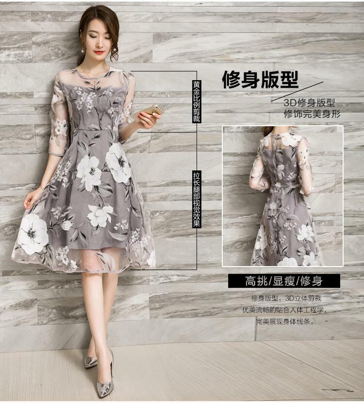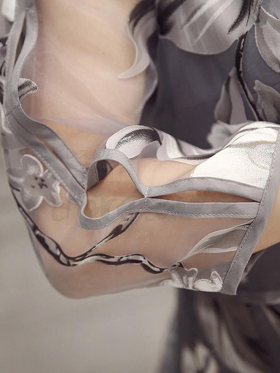シックなオーガンジーのワンピース。落ち着いたグレーの地にモノトーンの花模様がバランスよくプリントされています。デコルテライン、袖のほんのり肌見せ透け感がエレガントで魅力的な一着です。結婚式や謝恩会などに。背中ファスナー有。裏地あり。