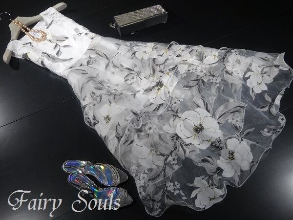 花模様のオーガンジ-マキシ丈のワンピース。薄い透け感がやわらかな印象を与えてくれています。大きなラウンドネックにノースリーブも全体の中でバランスが良く、ピュアでフェアリーなデザインになっています。煌めく太陽の光の中でも、また新緑の爽やかな風の中でも、着る人を美しく魅せてくれる一着です。前と後ろで丈の長さが違います後ろが長いです。裏地有り。右サイドファスナ-有。