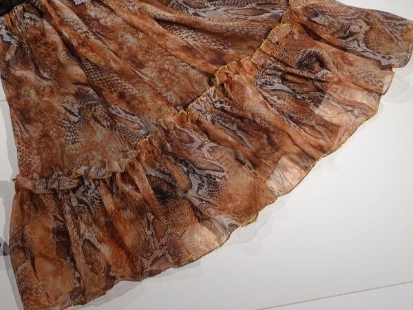 シルク100%の繊細なワンピ-スです。女性の美しさを際立たせる高級なお洋服です。シルクの肌触り軽やかさパイソン柄が大人の女性をイメージさせるデザインの一着です。裏地有。左脇下ファスナ-有。