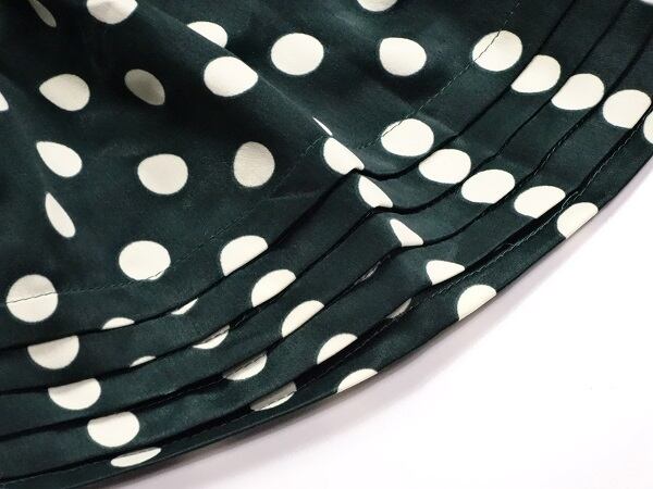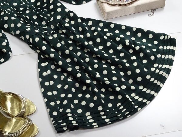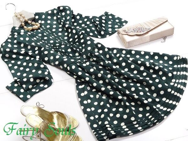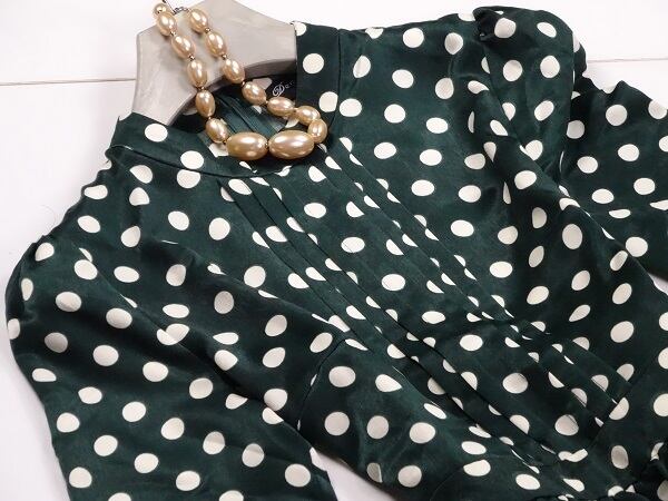グリ-ンの水玉模様の上品ドット柄ワンピ-スです。女性の輝きをアップさせるワンピ-スです。スカ-ト部分裏地有。背中ファスナ-有。