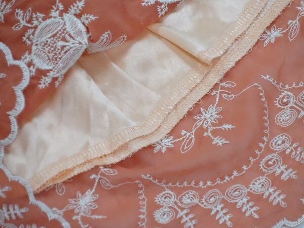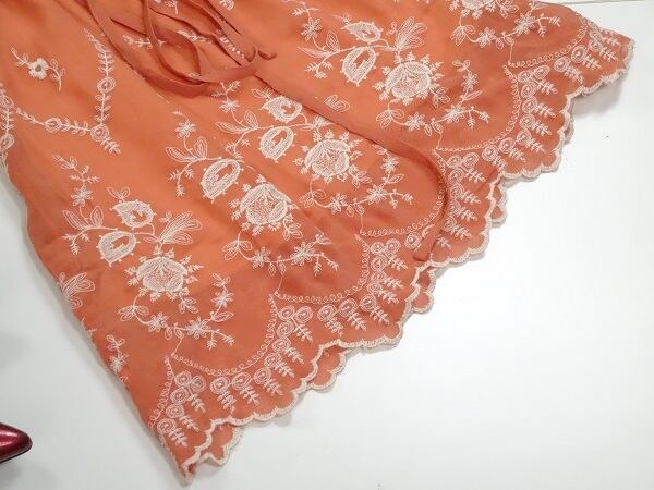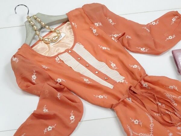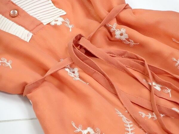胸元の花刺繍&プリ-ツフリルがとてもエレガントなワンピ-スです。デザインが上品で優雅な女性に変身させてくれます。フロントボタン開閉。裏地あり。紐ベルト付き。