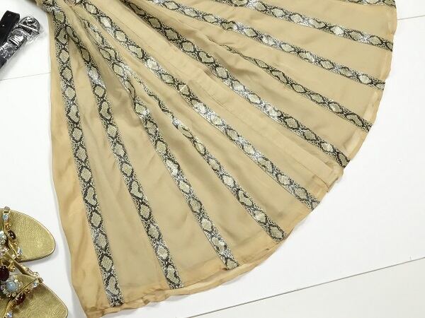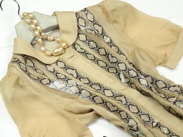 蛇柄ストライプのシ-スル-前開きワンピ-スです。襟や袖のデザインが上品でお召になられた時のシルエットがとても美しいです。前ボタン。ベルト付。裏地付。