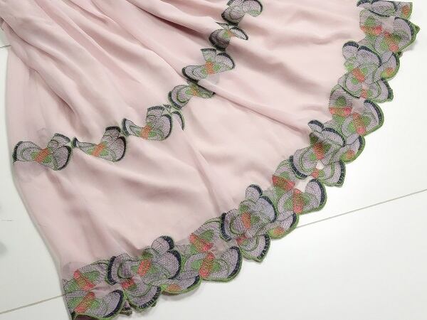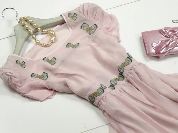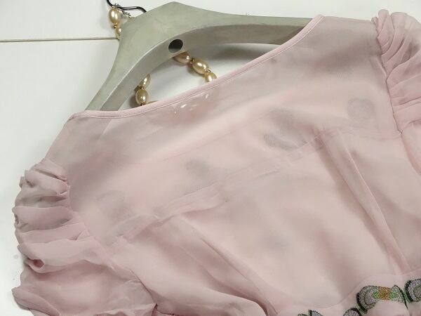 しなやかなピンクのシルクシフォン地にかわいい刺繍をあしらったキュートな一着。袖はタックをとりぷっくらとしたフォルム。裾は少し大きめの刺繍をモチーフの様に加工し立体感を出しています。ちょっとしたお呼ばれやパーティなどに最適。左脇下ファスナー。裏地有り。
