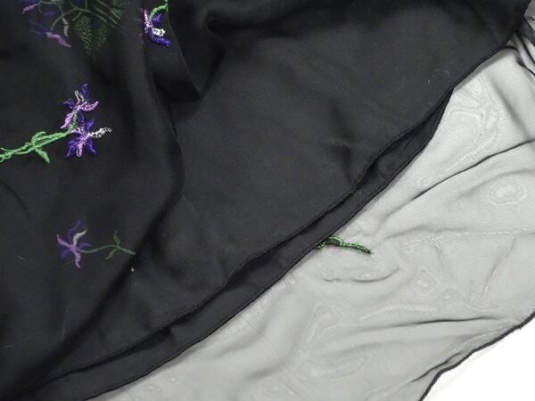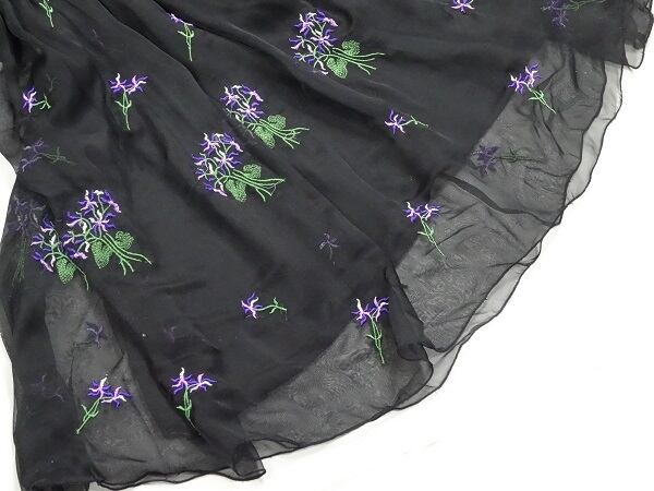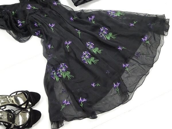 しなやかな黒のシルクシフォン地に鮮やかなピンクや白紫で可愛い小花を刺繍。襟ぐりは前後同じ深さのV字カットでセクシーに。袖はフリルを重ねて華やかさを演出。シックな中にかわいらしさもプラスした一着です。パーティやライブ、結婚式など華やかなシーンに最適。左脇下ファスナー。裏地有り。
