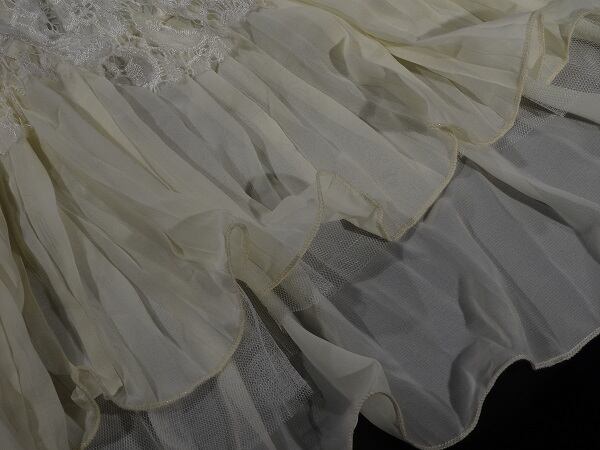 レース仕様重ねフリルのキュートなワンピース。綺麗なクリーム色のシフォン地の上につややかなレースをかぶせ華やかに。チュニック丈の上地からすそにかけてのスカート部分は、約1cm幅のプリーツ仕様になっています。レースカットの袖もキュート。オシャレ着にもカジュアルにも着用いただけます。ウエストはゴム仕様で伸縮性あり。ファスナーなしのかぶるタイプ。裏地有り。