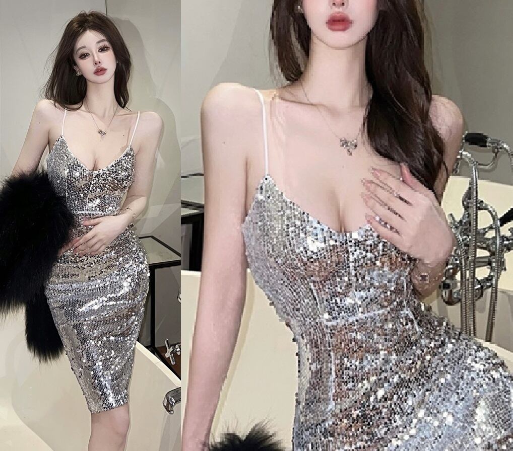 スパンコール後ろスリット入キャミワンピース。ネットチュールの上に銀のスパンコールをあしらったキャミソールワンピースです。後ろ側裾から上に約22cmのスリットが入っていて、動くたびに膝うらをチラ見せするセクシーなデザイン。スリムな大人の女性を醸し出してくれる一着です。裏地あり。背中ファスナ-。肩紐は長さ調整不可。
