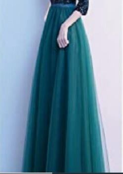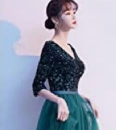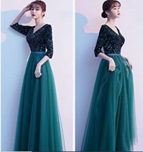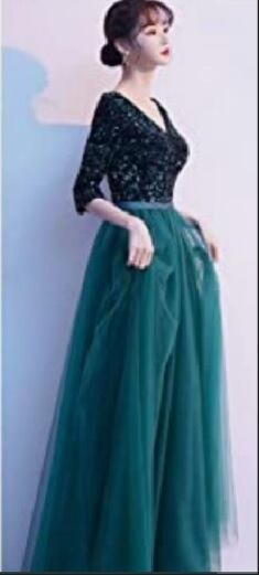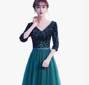 スパンコール仕様チュ-ルのロングドレス。深い緑のサテン地の上に、上半身は同色のスパンコールをほどこし、スカート部分は二重にチュ-ルを重ねた豪華でフェミニンなデザイン。V字の胸元が大人の雰囲気を醸し出し、シックで上品な女性を表現。パーティやイベント、コンサート、結婚式にと、さまざまシーンで活躍してくれる美しい一着です。裏地あり。背中ファスナー有。胸パット付。