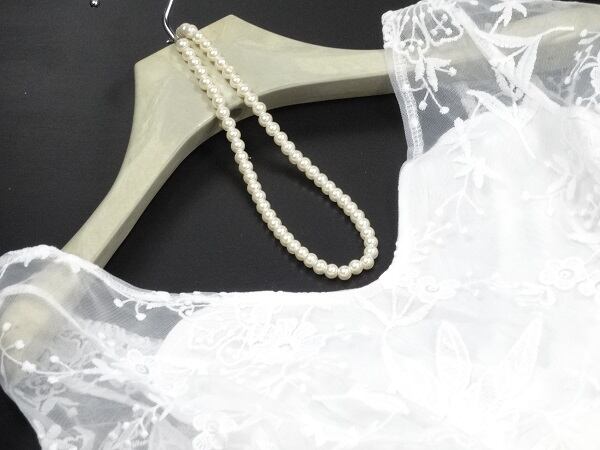 レース刺繍のロングドレス。白の下地の上に同色の糸を使用した刺繍をふんだんにあしらった白のチュールを重ねています。胸元から肩先にかけて立体刺繍が浮き立つようにデザインされており、デコルテラインから袖先に白のチュールが配されているのでずれたり落ちる心配はありません。背中はファスナーになっていて着脱しやすく、キュートな色合いでいてセクシーで豪華な印象に仕上がっています。背中ファスナー有。裏地あり。