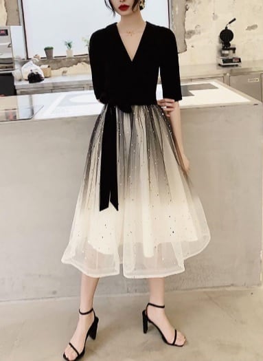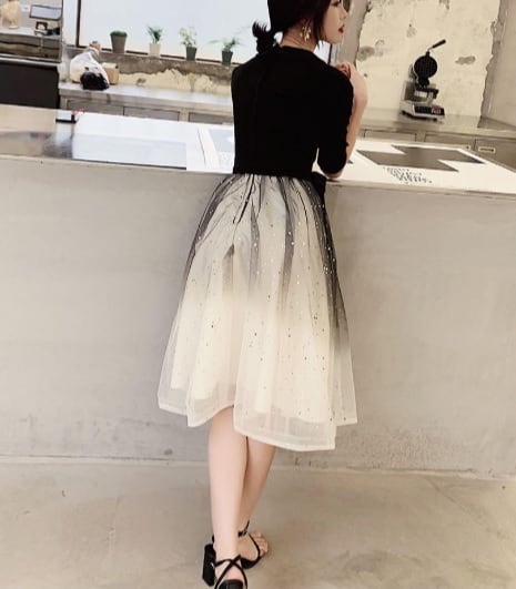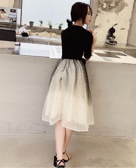 シフォンのミディアムドレスです。上半身は黒のポリエステル生地を使用し、ウエストから裾にかけては白のサテン地の上に白と黒のチュールを2枚重ねボリュームを出しています。またチュ-ルには全体的に星のビジュ-飾りが施されています。パーティやイベント、結婚式など、様々なシーンで、気品のある印象を与えてくれる一枚です。背中ファスナ-有。胸パッド付。ウエスト布ベルト付き(取り外し可能)。