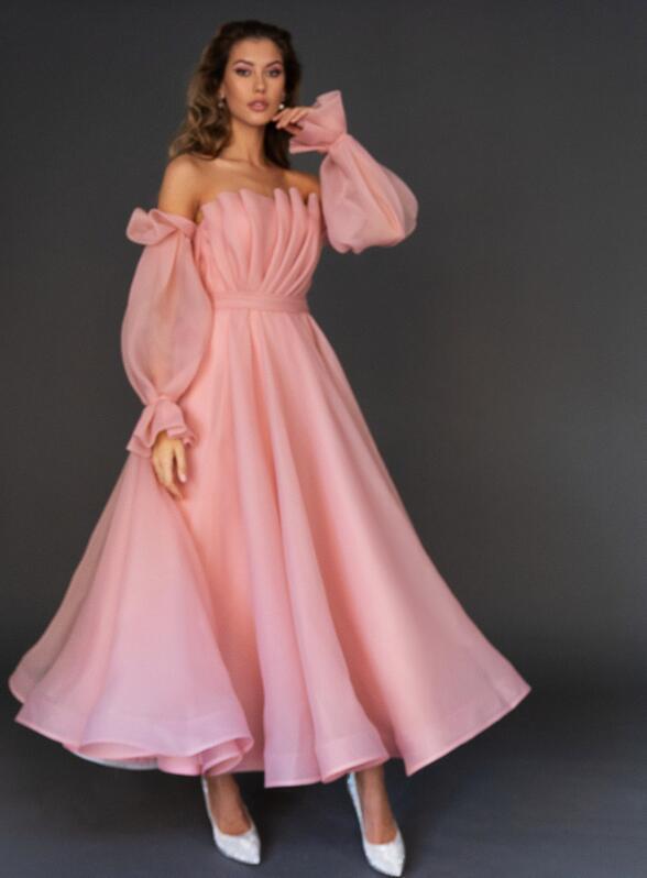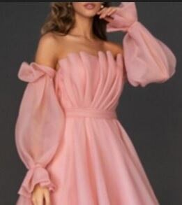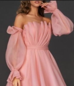 オフショルダ-パーティーミディアムドレスです。胸元はプリ-ツのセクシーな形。袖はたっぷりの生地を使用し袖先をきゅっと絞ったキュートなスタイル。気品のある印象に仕上がっています。パーティやイベント、結婚式など、様々なシーンで、気品のある印象を与えてくれる一枚です。背中ファスナー有。