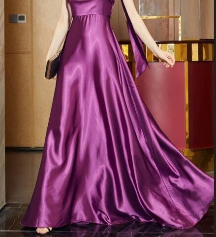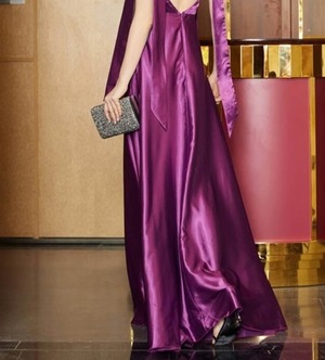 光沢のあるボルドーワインカラーのサテン地をふんだんに使用したドレス。肩紐は長いリボンになっていて方で結ぶデザイン。大きく開いた背中は左右のウエストから反対側の肩にかけて渡したサテン地のリボンがセクシーな印象に。パーティやライブ、イベント、結婚式など、どんなシーンでも活躍してくれる一着です。背中ファスナー有。裏地なし。肩はリボンの結び具合で調整可能。