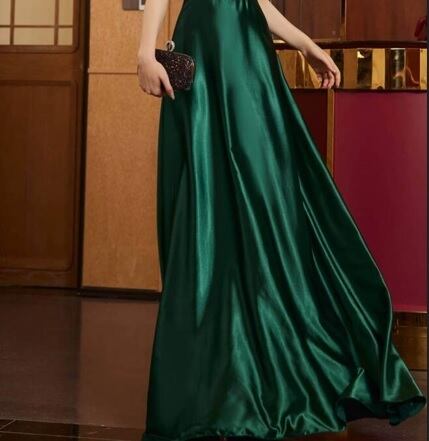 光沢のある鮮やかなグリーンのサテン地をふんだんに使用したドレス。フロント部分はシンプルなキャミソールタイプですが、大きく開いた背中は左右から細い紐リボンを編み状に編んだようなデザインになっていてセクシーな印象に。パーティやライブ、イベント、結婚式など、どんなシーンでも活躍してくれる一着です。背中ファスナー有。裏地あり。肩ひも調整可能。