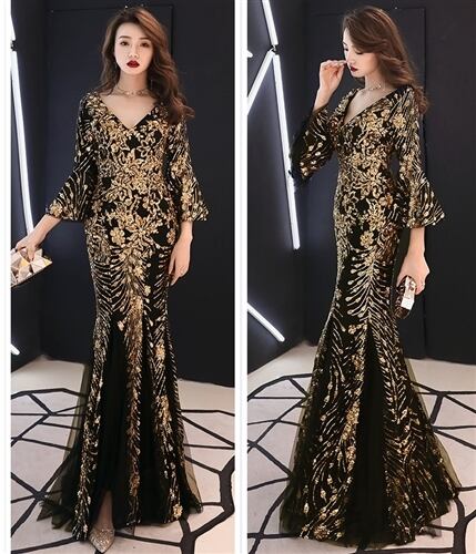 チュールとスパンコールのマーメイドドレス。落ち着いたベージュのチュール地に鮮やかな金のスパンコールをふんだんに使用した豪華なデザイン。袖先と裾先はチュールが広がり、くびれたウエストがセクシーさを醸し出しています。パーティやライブ、イベントなど華やかなシーンに。デザイン上伸縮性はそれほどなく体のラインにフィットしたシルエットです。背中ファスナー有。裏地有。