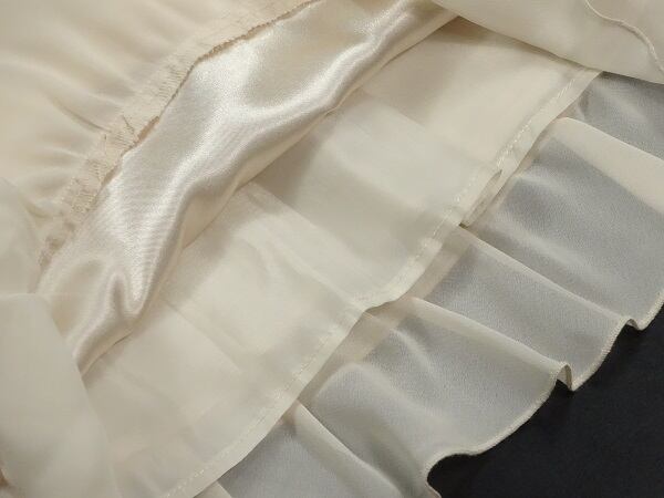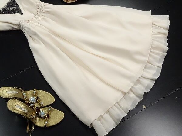 胸元が黒のレ-スになっているとてもエレガントなフレア-ドレスです。裾のフリルがとても可愛いです。着心地の良い、上品な印象の一着です。左脇下ファスナーあり。裏地付。