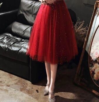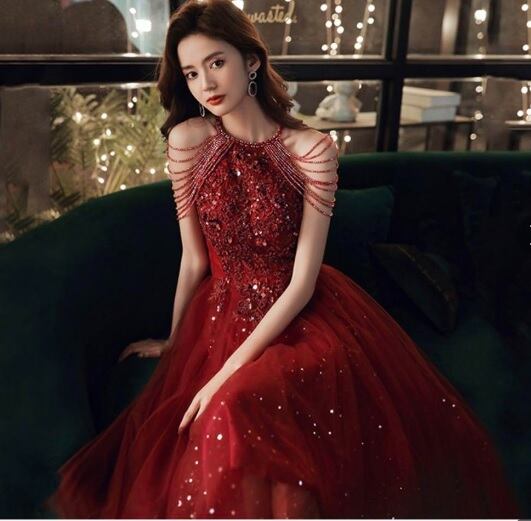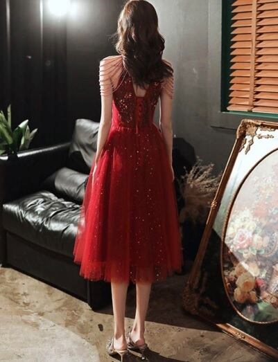ホルダ-ネックチュールミディアムドレスです。ワインレッドのサテン地に同色のチュールを3枚重ね、トップス部分は刺繍とビジュ-が施されたとてもエレガントなデザインです。又、ビジュ-は全体的に施され、背中は編紐掛けなので、バストのサイズにゆとりをもって着用いただけます。パーティやイベント、結婚式など、様々なシーンで、気品のある印象を与えてくれる一枚です。背中網掛け。背中腰から下ファスナ-有。胸パット付。裏地なし。