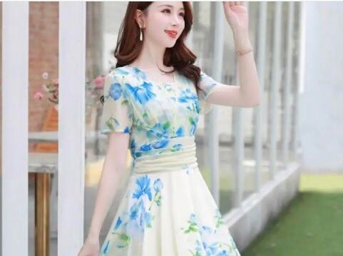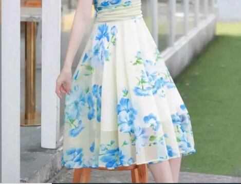 花柄マキシ丈シフォンフレア-ワンピ-スです。ウエストから裾にかけてはたっぷりと生地を使用したフレア-。うすい黄色に青と黄緑の花模様をプリント。エレガントでフェミニンな一着です。ファスナ-なし(かぶるタイプ)。裏地付。