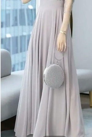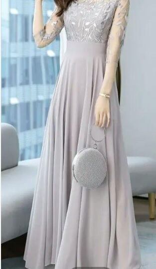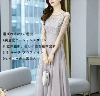 スパンコール刺繍とシフォンのドレス。トップス部分前後のスパンコールと光沢のある白糸の刺繍がシックで華やかな印象に。胸元と袖の透け感がデコルテラインと二の腕を綺麗に見せてくれていてセレブリティ-な雰囲気で、ウエストの切り替えからシフォン素材が大きく広がるスカート部分のボリューム感が魅力的なデザイン。結婚式の二次会、コンサート、パーティなど、華やかなシーンに最適な一着です。裏地あり。右脇ファスナ-有。