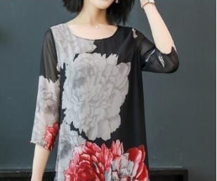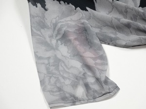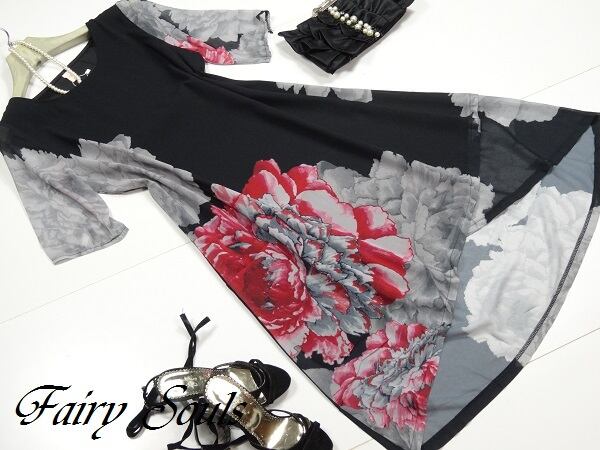 花プリントミモレ丈ワンピ-ス。黒の色合いに花柄模様をプリントしたしなやかな素材。丈が前より後ろが少し長めになっています。ファスナーなし(かぶるタイプ)。裏地有。