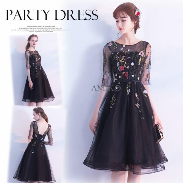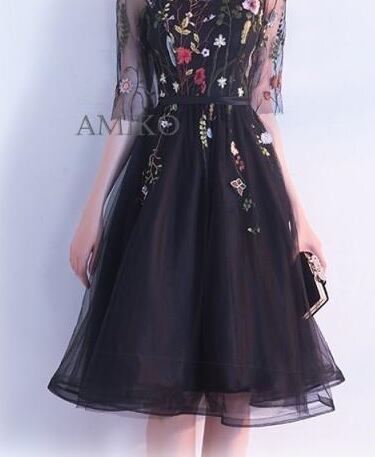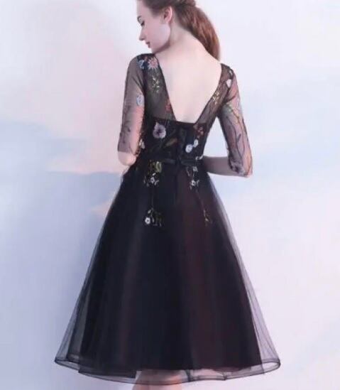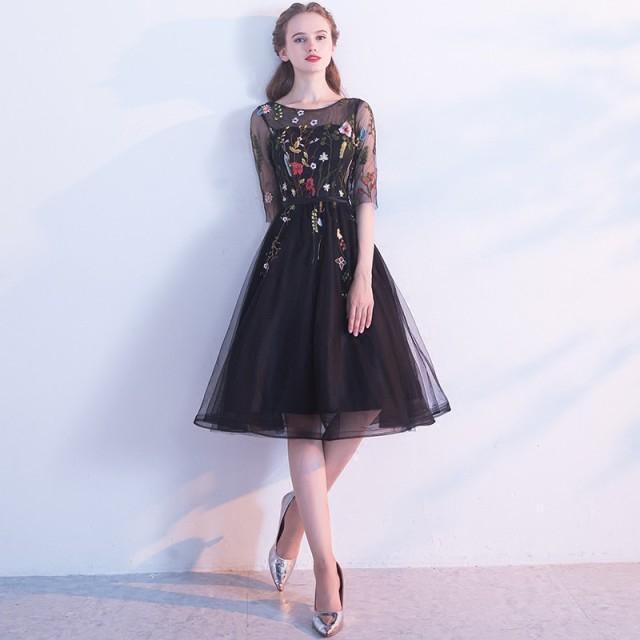 花刺繍ミモレ丈チュ-ルパ-ティ-ドレスです。黒のサテン地の上に、黒の花刺繍をほどこしたチュ-ルが重ねられた豪華でフェミニンなデザイン。デコルテラインから肩にかけての透け感が大人の雰囲気を醸し出し、シックで上品な女性を表現。パーティやイベント、コンサート、結婚式にと、さまざまシーンで活躍してくれる美しい一着。背中網掛け。腰下ファスナー有。胸パット付。