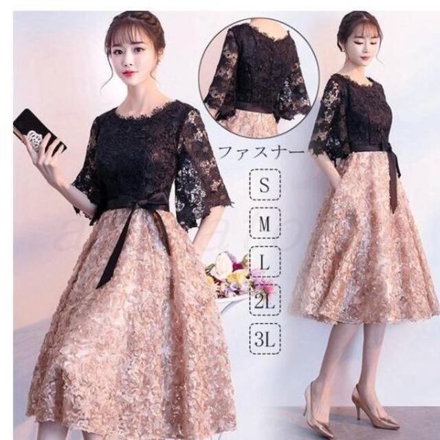 トップスレ-ス仕立ドレス。トップスは黒のレ-ス仕立て。スカート部分はピンクベージュの花レース風。女性らしさとエレガントさを同時に演出した一品です。胸パット入り。背中ファスナー。裏地付。布ベルト付き。