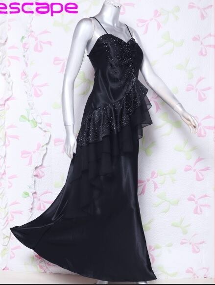 光沢フリルロングドレス。腰から右サイドに流れるようなフリルがとてもエレガントで軽く、体にフィットしたスリムな大人の女性を醸し出してくれる一着です。裏地なし。左サイドファスナ-あり。肩紐は長さ調整可。