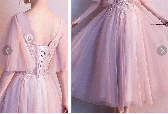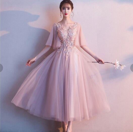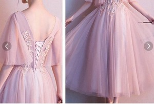 チュール袖フリルのパ-ティ-ミディアムドレス。ピンクのサテン地の上に同色のチュールを重ねた豪華な仕様。トップス部分は立体刺繍を施し、袖は肩からたっぷりとチュールを使用した広がるデザインで動きやすくなっています。背中はウエスト部分まで編紐掛けなので、バストサイズにゆとりをもって着用いただけます。パーティやイベント、結婚式など、様々なシーンで、気品のある印象を与えてくれる一枚です。裏地有。背中網掛け。腰下ファスナ-有。胸パット付き。