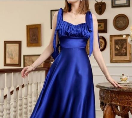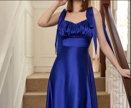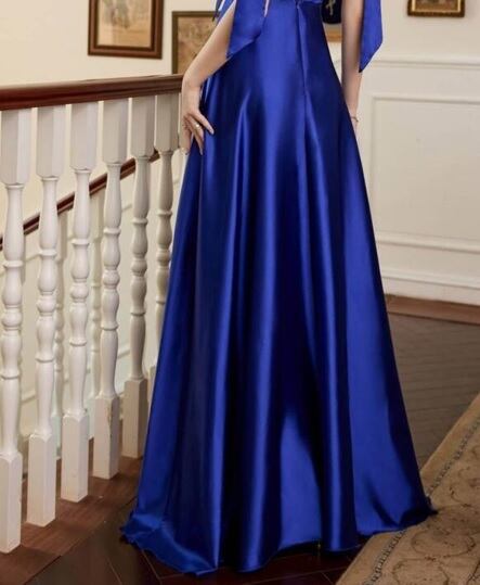 光沢のあるネイビ-カラーのサテン地をふんだんに使用したドレス。肩紐は長いリボンになっていて方で結ぶデザイン。大きく開いた背中は左右のウエストから反対側の肩にかけて渡したサテン地のリボンがセクシーな印象に。パーティやライブ、イベント、結婚式など、どんなシーンでも活躍してくれる一着です。背中ファスナー有。裏地なし。肩はリボンの結び具合で調整可能。