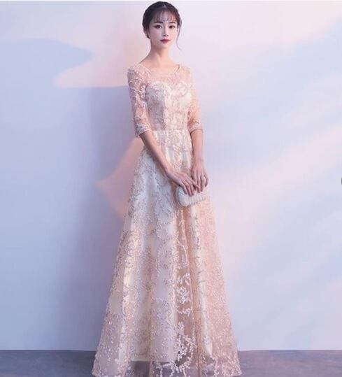 リボン刺繍のパーティ-ロングドレス。袖やデコルテの透け感がとても美しく大人の女性を醸し出してくれるエレガントなデザイン。全体にクリームカラーの立体刺繍が施されデザイン性のあるスタイルがとても魅力的な一着です。全体的に優しい感じに仕上げられています。背中ファスナ-有。胸パット付き。裏地有。