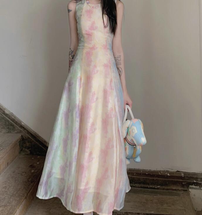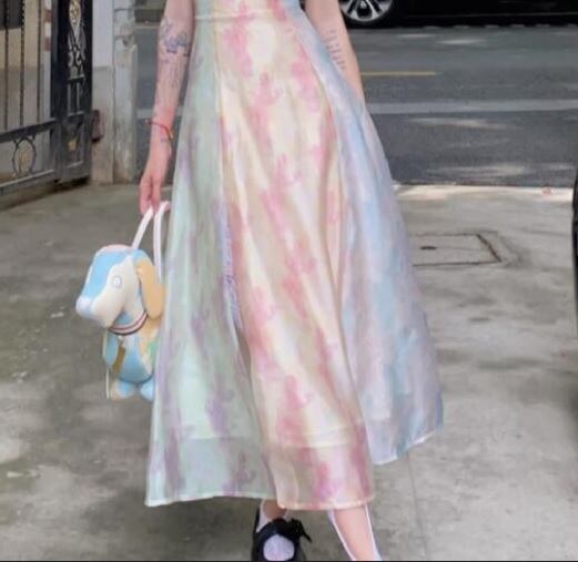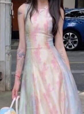 スリット入りロング丈のワンピ-ス。ピンクをベースにパステルカラーのMIXが軽やかなイメージに。ラインはシンプルですが、左裾から上に約45cmのスリットが入っていて、フェミニンで上品な印象を与えてくれている一着です。標準のMサイズよりもウエストがゆったりしているので楽に着て頂けます。裏地有。背中ファスナ-あり。