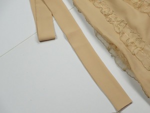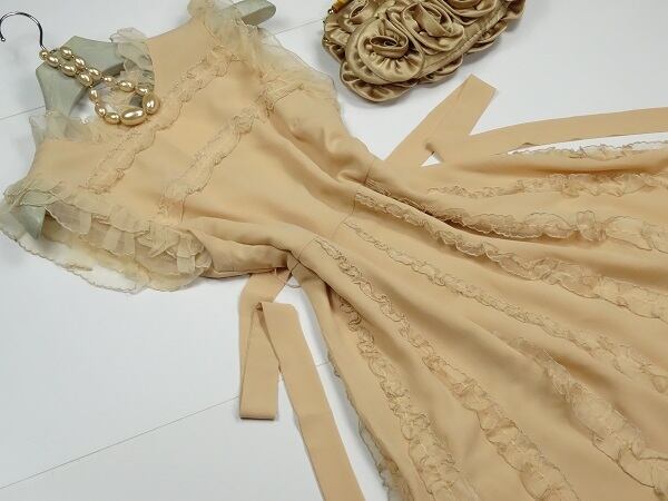 胸元やスカ-ト部分にレ-スが施されたとてもエレガントで落ち着いた印象の中に可愛らしさがいっぱいにプラスされた魅力的なデザインです。背中ファスナーあり。裏地つき。紐ベルト付き。