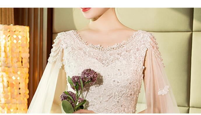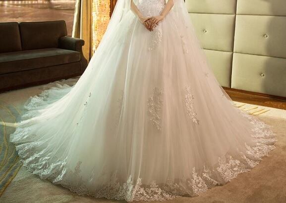 パニエ付刺繍とチュ-ルのウェディングドレス。清楚な白のサテン地の上に白の刺繍を施したチュールをあしらった華やかなデザイン。上半身はレース刺繍を全面に施し、背中は腰まで編み紐掛けになっているのでサイズ調整が可能です。袖はノースリーブに3連のフェイクパールのチェーンをあしらい、肩先から裾にかけて約210cmのチュールが重ねられているので、広がりがあり大変豪華なデザインになっています。付属のパニエを着用頂くと、ボリューム感がアップし、より一層豪華さが増します。結婚式でウェディングドレスとしてはもちろん、パーティやライブ、イベントなどどんなシーンでも活躍してくれる一着です。裏地有。背中編み紐掛け。胸パット付き。パニエ付き。ショ-ル付。手袋付き。