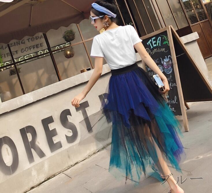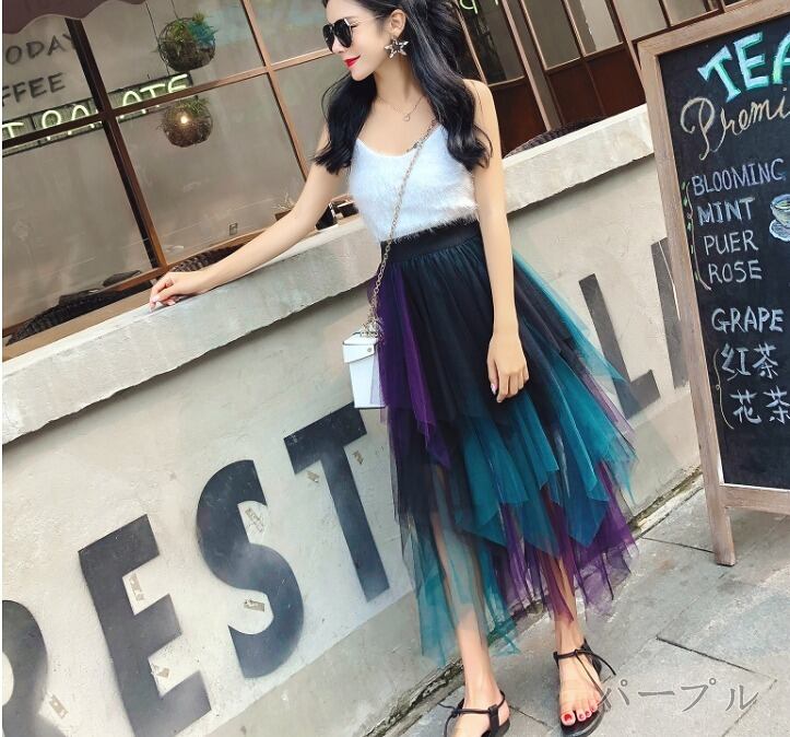 ランダムカットチュ-ルのロングスカ-ト。落ち着いたダークカラーに差し色の緑や紫のチュールを被せた柔らかな揺れ感が素敵です。ランダムにカットされた裾の重なりが足元を引き立ててくれてとてもファミニンなデザイン。ウエストゴム仕様。ファスナ-なし。裏地付。