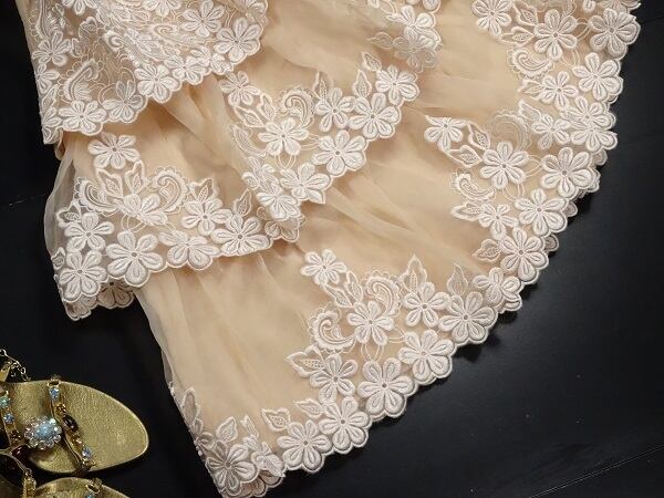 刺繍がとても素敵で高級感溢れるかわいらしいデザインのワンピ-スです。左脇下ファスナ-有。裏地有。
