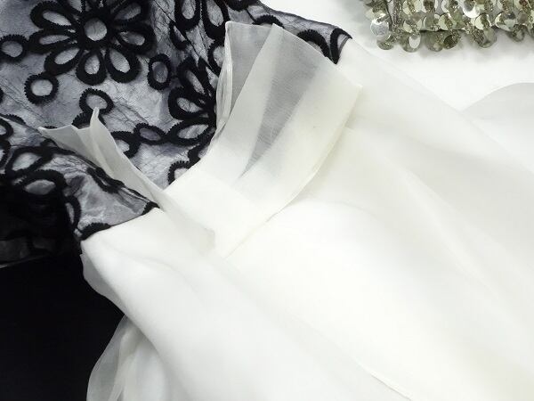 黒の花柄刺繍が透け感のあるシフォン生地に美しく映えるワンピース。スカート部分は、重なったシフォンから下地のサテン生地が薄く透き通って見えていて、ウエストの大きなリボンが上品な中に可愛らしさをプラスしてくれています。背中はV字カットになっていて、後姿をセクシーにみせています。背中ファスナー。裏地有。