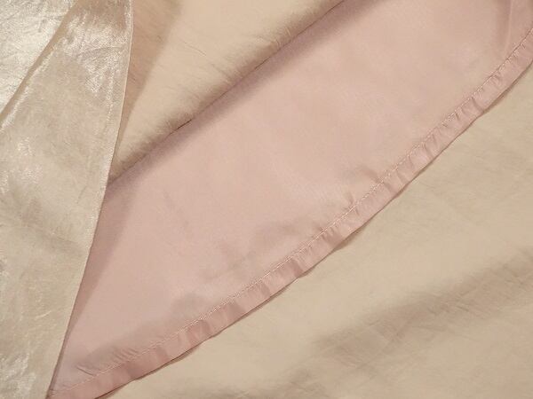 光沢感のあるつるつるサテン生地で腰部分がドレ-プになっていて女性らしいデザインになっています。前と後ろが丈の長さが違いとても素敵なデザインです。裏地あり。左脇下ファスナ-有。