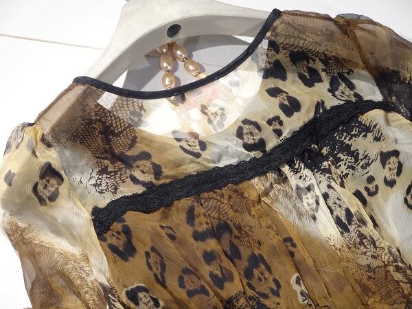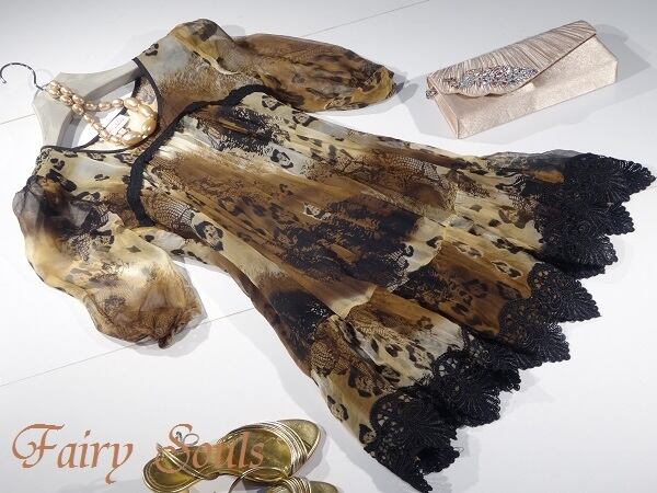 茶色系のグラデ-ションの色合いが素敵でシルクな優しい着心地が最高のワンピ-スです。裏地あり。ファスナ-なし(かぶるタイプ)。